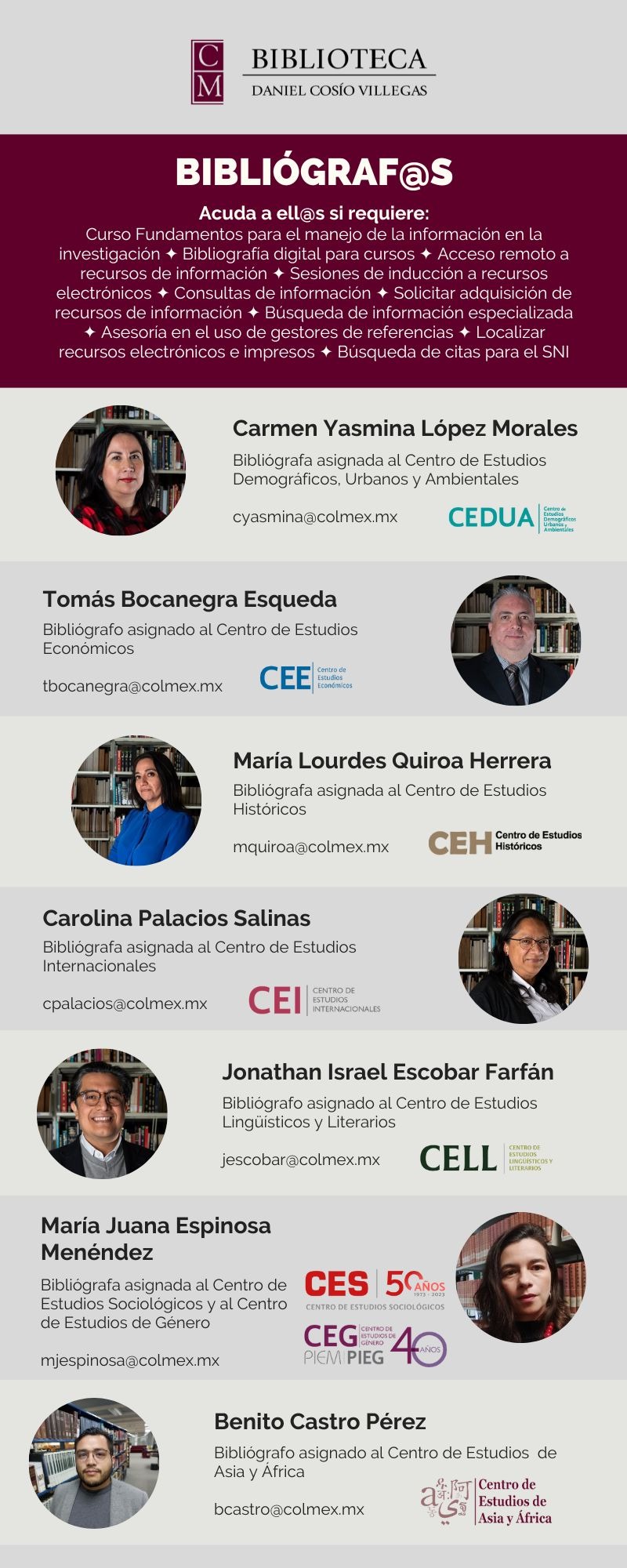 Durante el periodo de la contingencia, el grupo de bibliógrafos atenderá las consultas y solicitudes de información de la comunidad académica del Colmex por las siguientes vías: